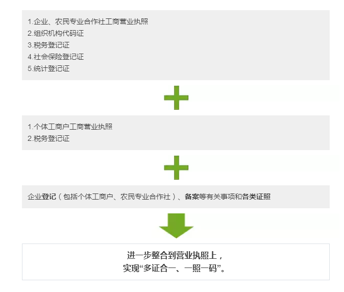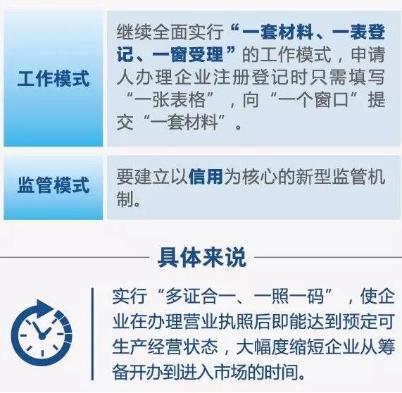 对于企业来说,申请人办理企业注册登记时只需填写“一张表格”,向“一个窗口”提交“一套材料”,不再另行办理“多证合一”涉及的被整合证照。改革实施前已领取加载统一社会信用代码营业执照的企业,也不需要重新申请办理“多证合一”登记,由登记机关将相关登记信息通过全国信用信息共享平台共享给被整合证照涉及的相关部门。未领取“一照一码”营业执照的市场主体在其原证照有效期满、申请变更登记或者申请换发营业执照时,由登记机关换发加载统一社会信用代码的营业执照。